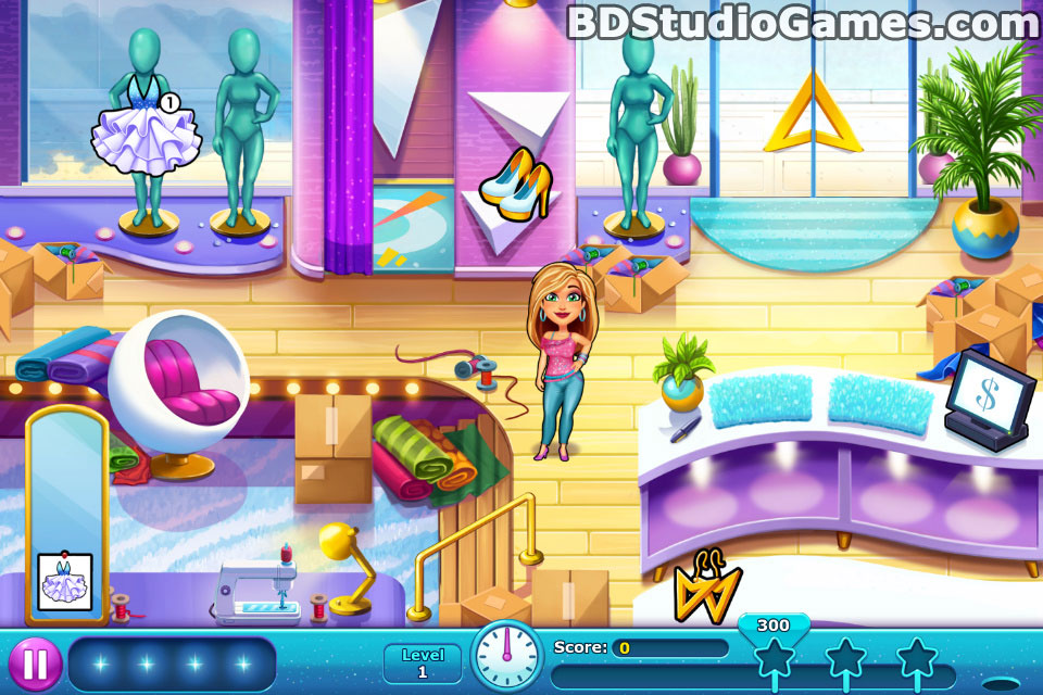 Deliver products quickly or check out multiple customers at once to earn bonus points. Tap to clean the fitting room. Tap on the image of the dress to restock it.