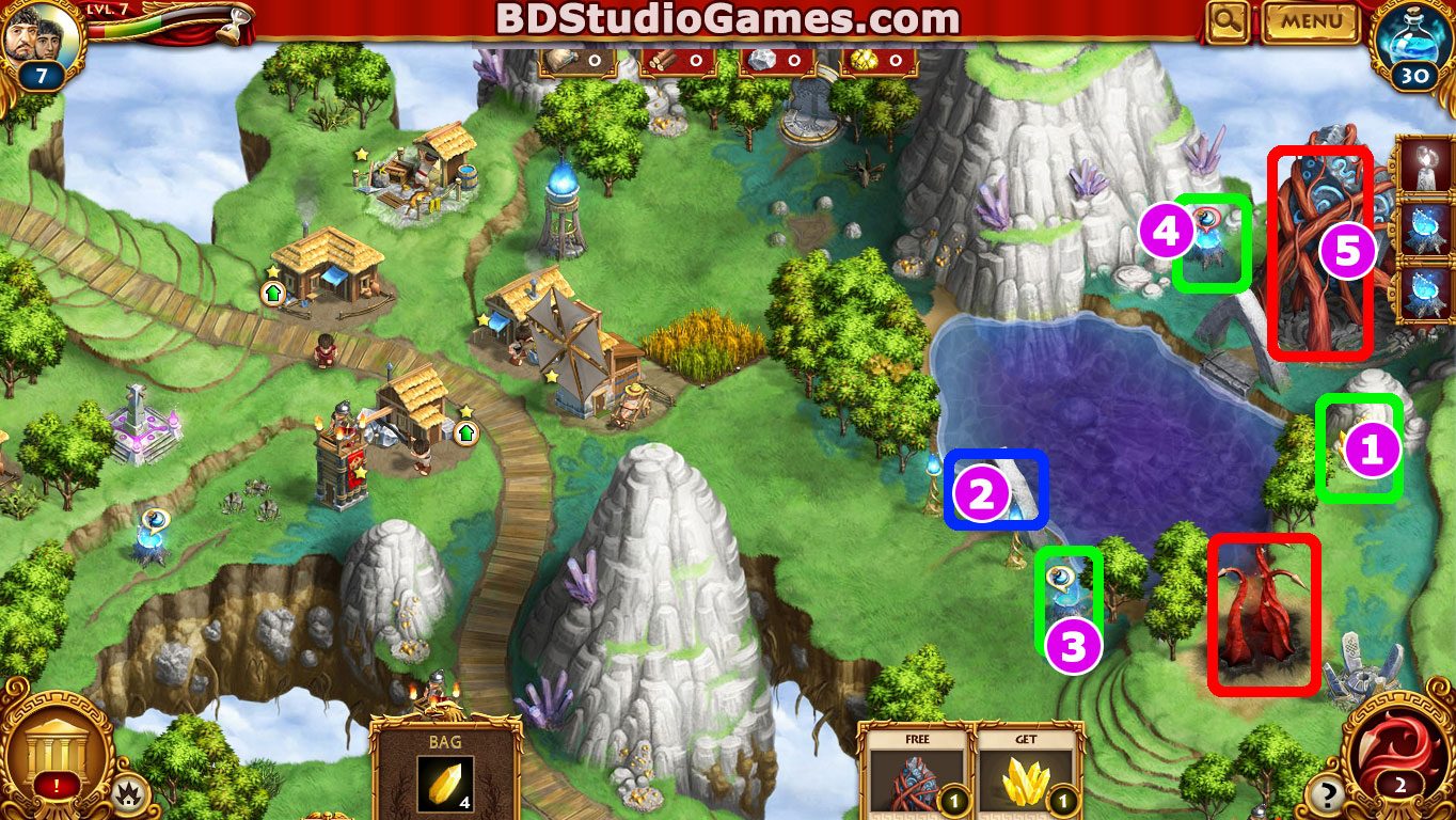 Level 7: collect raido rune and uncover the map, then collect manas and attack the evil roots, collect 5 yellow crystal and get the purple gem from the people located in the top left corner, use the purple gem on the arch of elf bridge and complete this level, see below screenshots:
