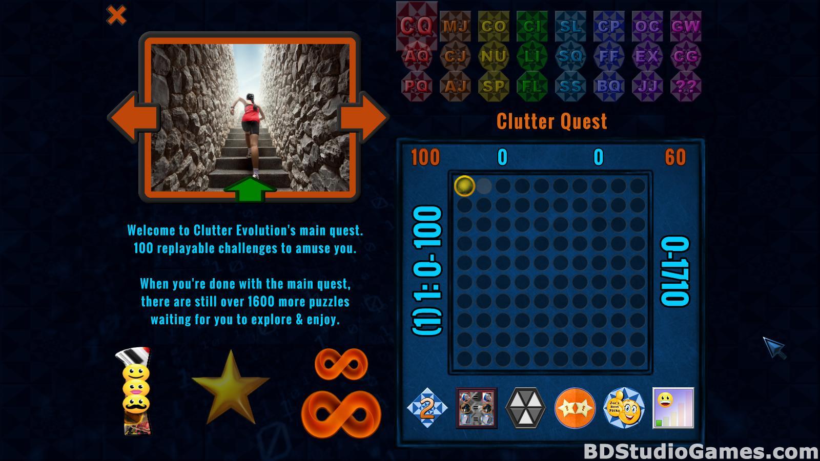Welcome to Clutter Evolution's main quest. 100 replayable challenges to amuse you. When you're done with the main quest, there are still over 1600 more puzzles waiting for you to explore & enjoy.